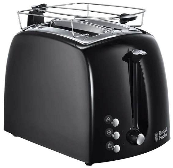 Plastový topinkovač s chromovými prvky, 2 široké otvory, nastavitelný stupeň opečení, mřížka pro ohřívání pečiva, funkce rozmrazit, STOP a znovu zahřátí se světelným indikátorem, vyjímatelný tác na drobky, obsahuje kleště na topinky, barva černá
