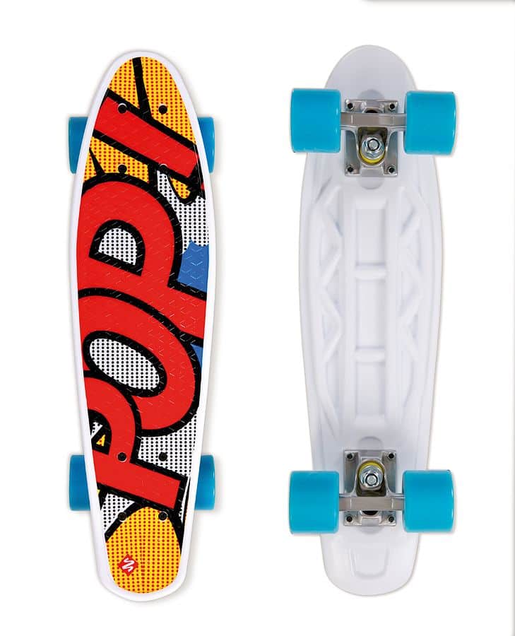 Jedinečný design tohoto skateboardu našel inspiraci v pop kultuře šedesátých let minulého století. Tehdy vznikl nový umělecký směr - Pop Art. Originální POP BOARD je stvořen pro zábavu a snadnou jízdu. Vyndej ho z batohu a jeď.VLASTNOSTI:deska vysoce odolný jednolitý PP plastpotisk desky ve vysokém rozlišenírozměr desky 54,9x15,5cm (21,6"x6,1")rozvor mezi kolečky 29 cmtrucky 3,25" ALU potištěnékolečka 60x45mm, 80A, PU, hranaté okrajesilentblok (bushing) 97Aložiska ABEC 7 doporučený věk 5+ hmotnost 1,8kg max. nosnost 100kg