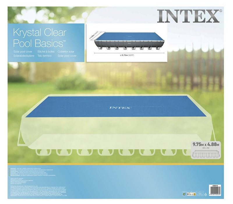 INTEX solární plachta pro bazény o velikosti 9,75 × 4,88m o průměru 960×466 cm. Pomáhá udržet vodu teplou a sníží odpařování vody o 95%.