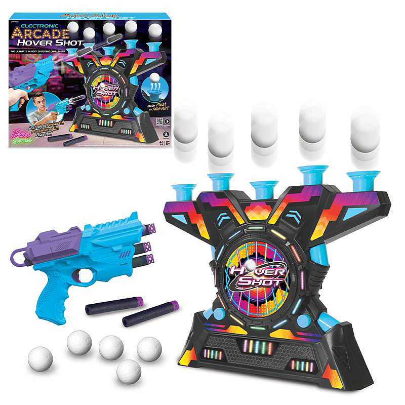 Nejlepší hra pro střelbu na cíl je zpět a lepší než kdy předtím! Hover Shot 2.0TM nabízí veškerou zábavu původní hry Hover ShotTM s významnými vylepšeními ve výkonu! V této hře na střelbu se každý snaží zasáhnout co nejvíce cílů, ale toto nejsou normální cíle! Zapněte stroj Hover Shot 2.0TM a 5 míčků je zavěšeno ve vzduchu proudem vzduchu! Obsahuje výkonný, přesný blaster a šipky. Zamiřte a vystřelte! Kolik ran potřebujete, na sestřelní všech vznášejících koulí ze VZDUCHU? Pro 1-2 hráče. Vyžaduje 4 x 1,5VC baterie (nejsou součástí balení). Doporučeno pro děti od 6 let.
