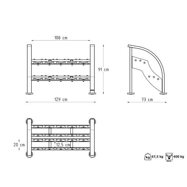Profesionální stojan na činky MARBO MF-S002 je jedním ze základních prvků každé posilovny, který šetří místo, pomáha udržovat pořádek a zlepšuje přehlednost Vašich činek. Stojan je modulární - lze je dodat po jednotlivých kusech (129 cm), které je možno spojit do libovolné délky. Konstrukci stojanu tvoří ocelové profily 100 x 50 a 100 x 40 mm, to zaručuje maximální nosnost 400 kg na modul. MF-S002 má 2 police, ty jsou opatřeny ogumováním na které uložíte 5 párů činek s minimální délkou úchopu 125 mm a maximálním průměrem 210 mm.