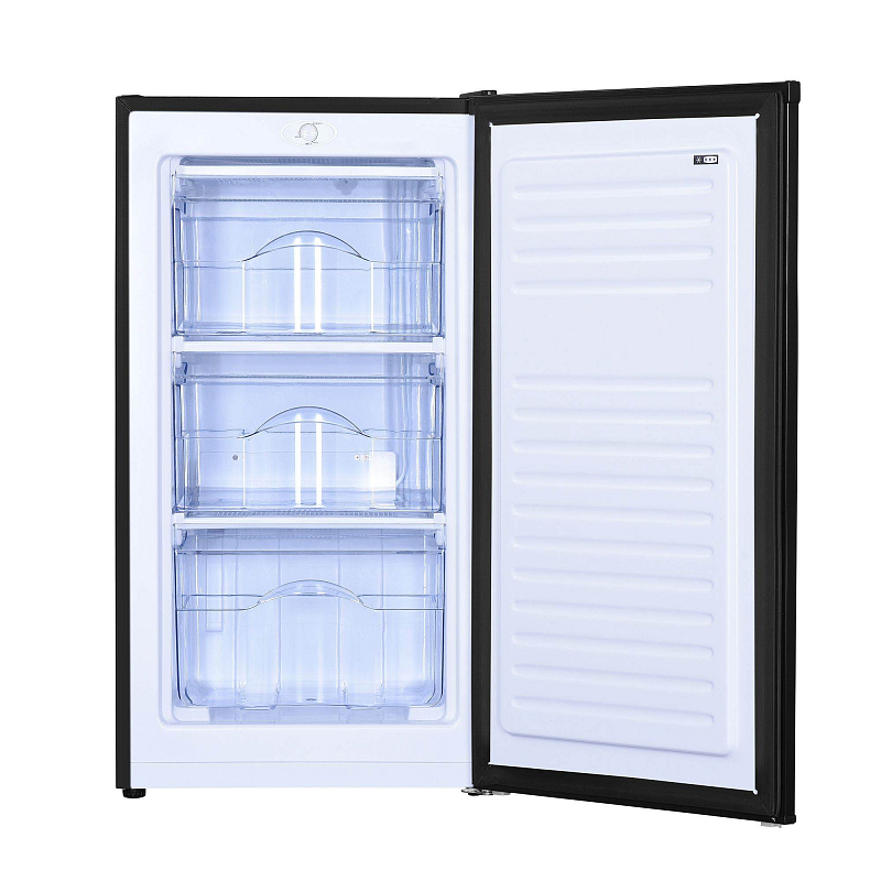 Volně stojící šuplíkový mrazák o objemu 64 l *. Energetická třída D se spotřebou 126 kWh/rok. Černá barva. Kompaktní rozměry s výškou do 85 cm. Panty dveří lze přehodit.