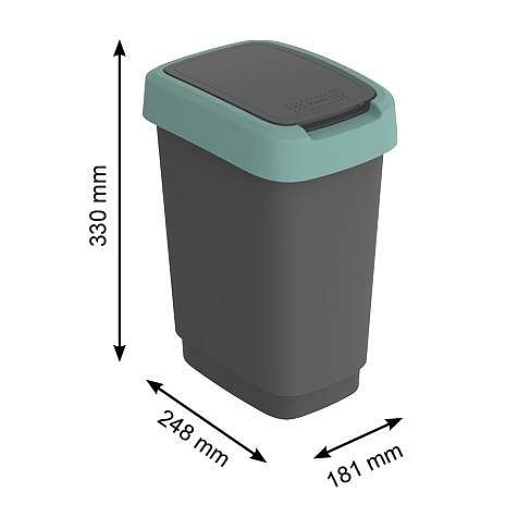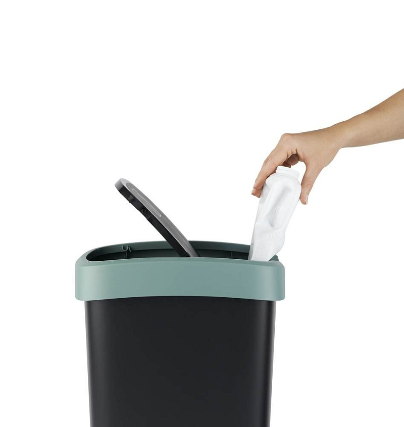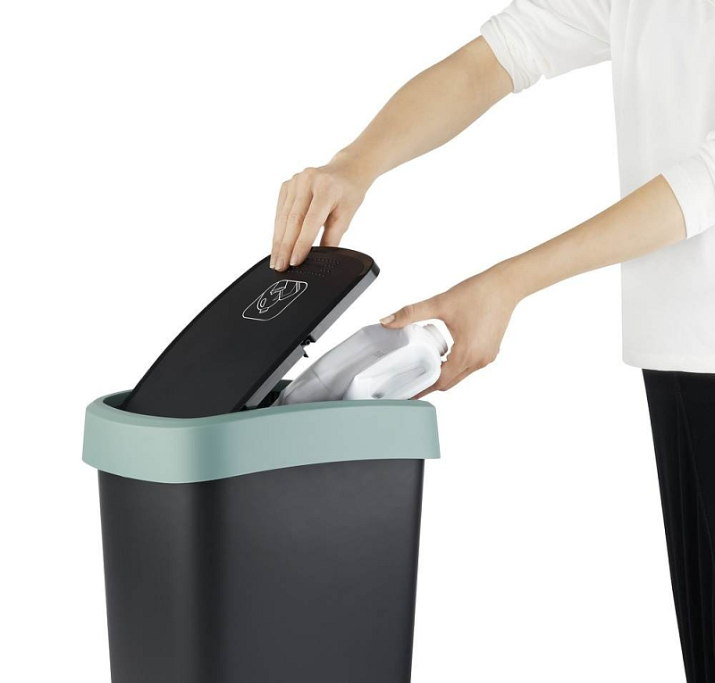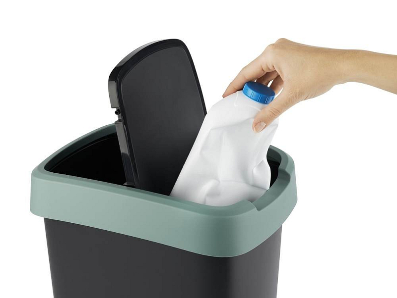 Plastový odpadkový koš s odklápěcím víkem. Dva způsoby otevření koše. Objem:10litrů. Kvalitní materiál a provedení od švýcarské značky Rotho.