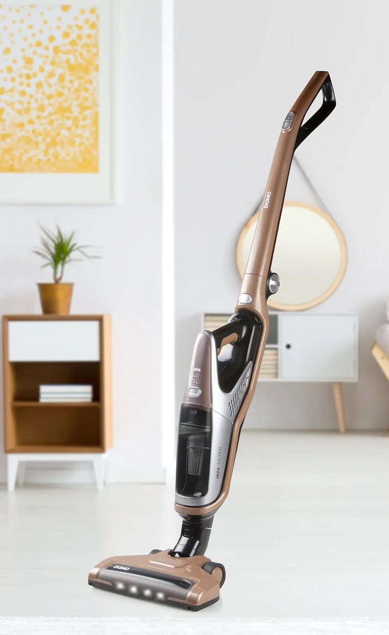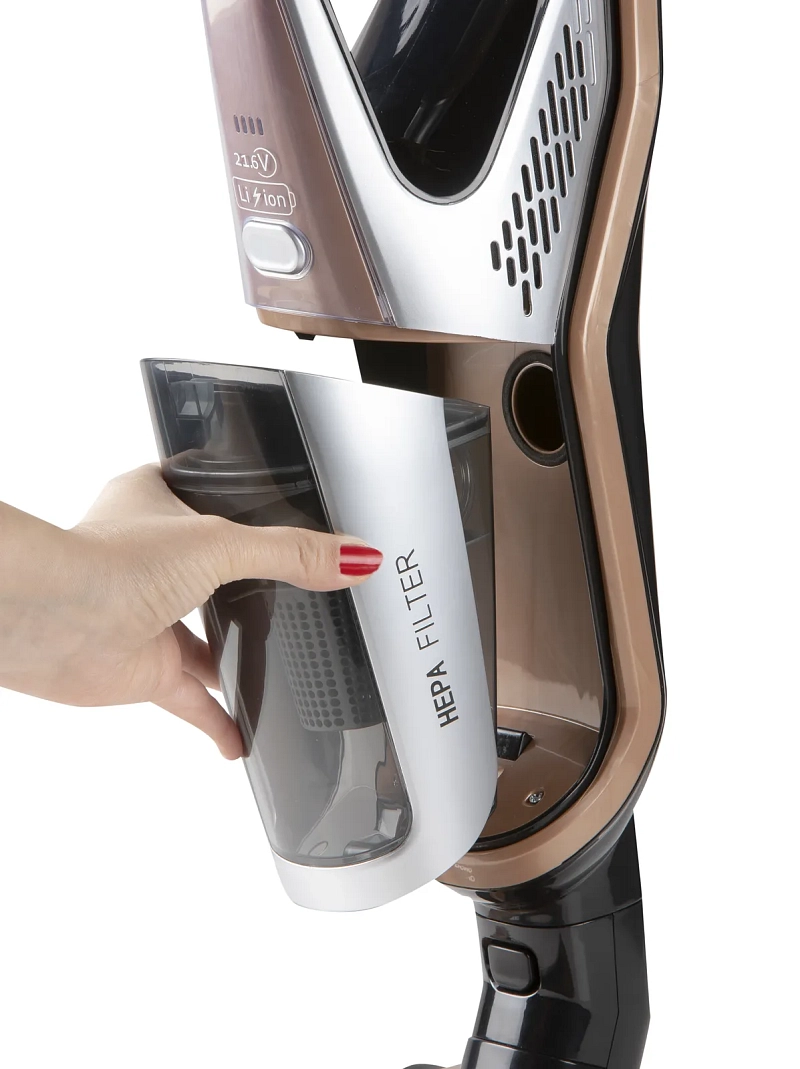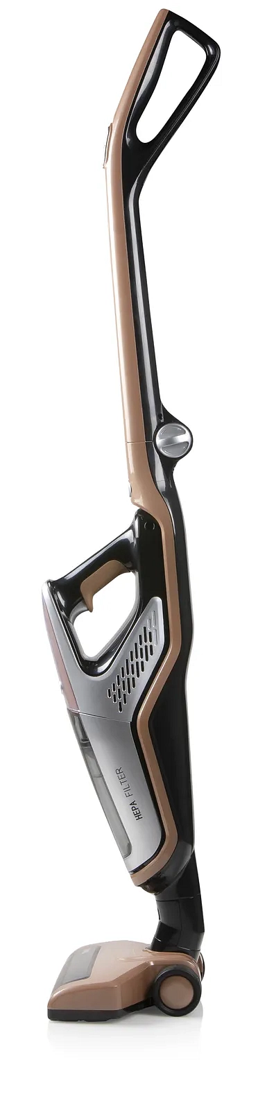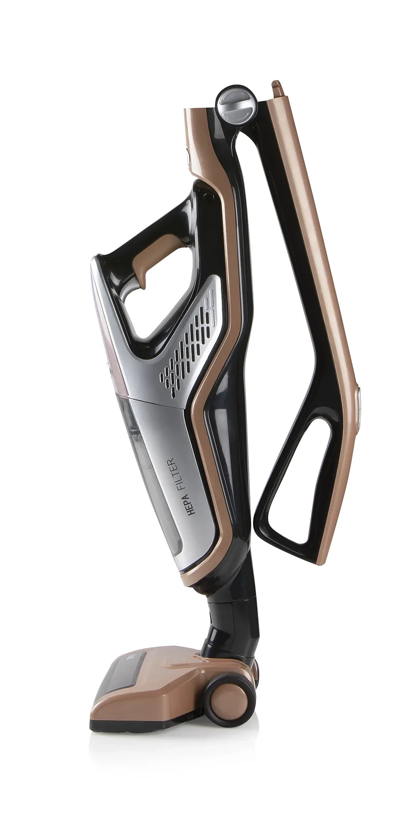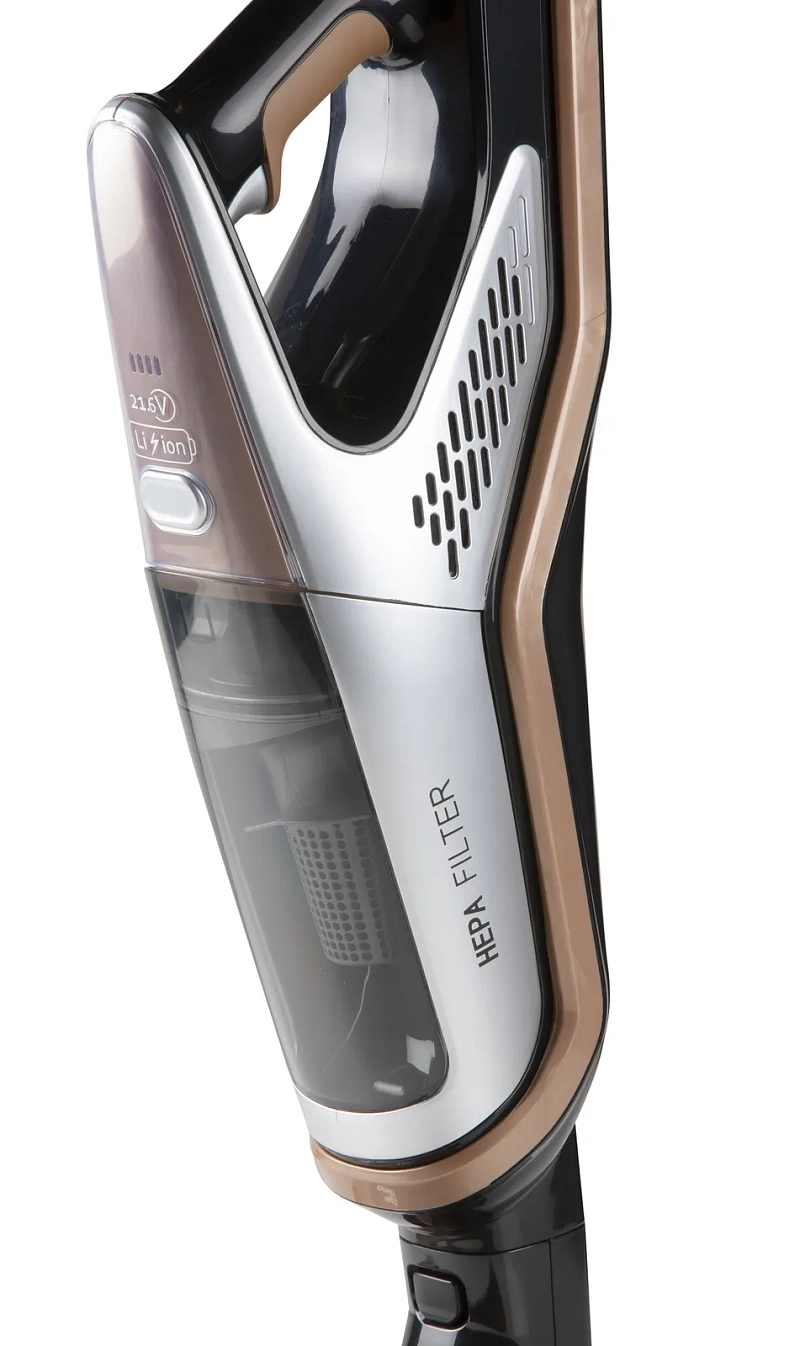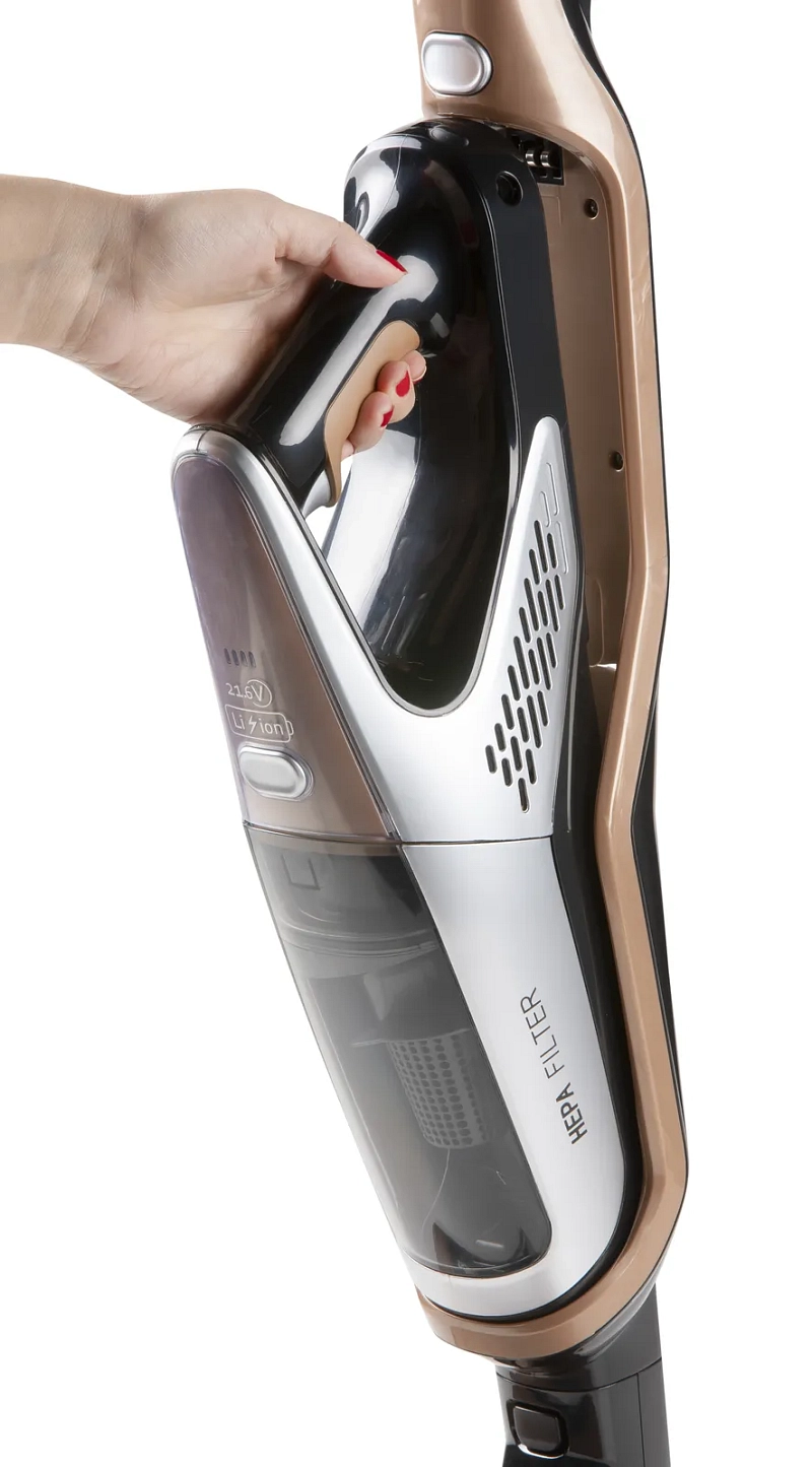 Tyčový vysavač 2v1 s ručním vysavačem. Napájení Li-ion akumulátorem o napětí 21,6 V s výdrží až 65 min vysávání. Podlahová hubice s turbokartáčem na všechny povrchy. Barva: zlatá.