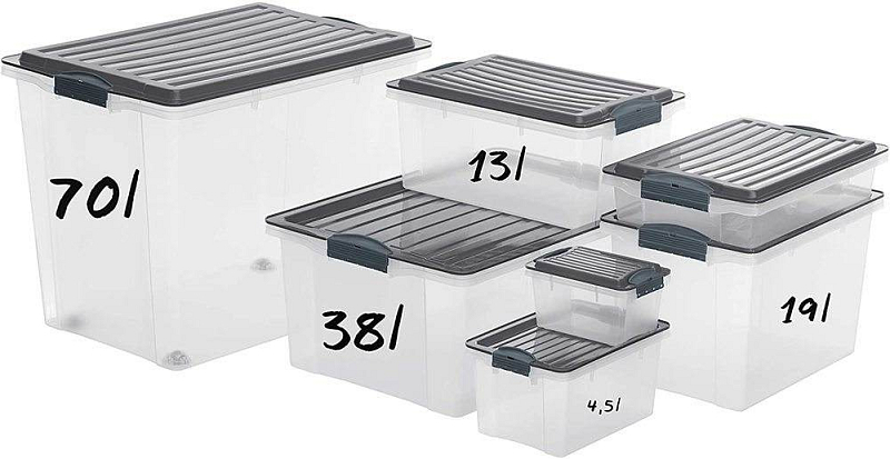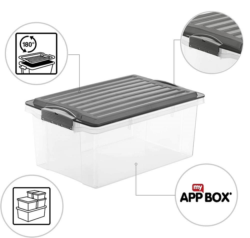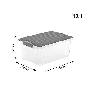 Úložný box o objemu 13L. Transparentní box + šedé víko. Víko je opatřeno klipy proti nežádoucímu otevření. Box je vhodný proformátA4. Kvalitní materiál a provedení.
