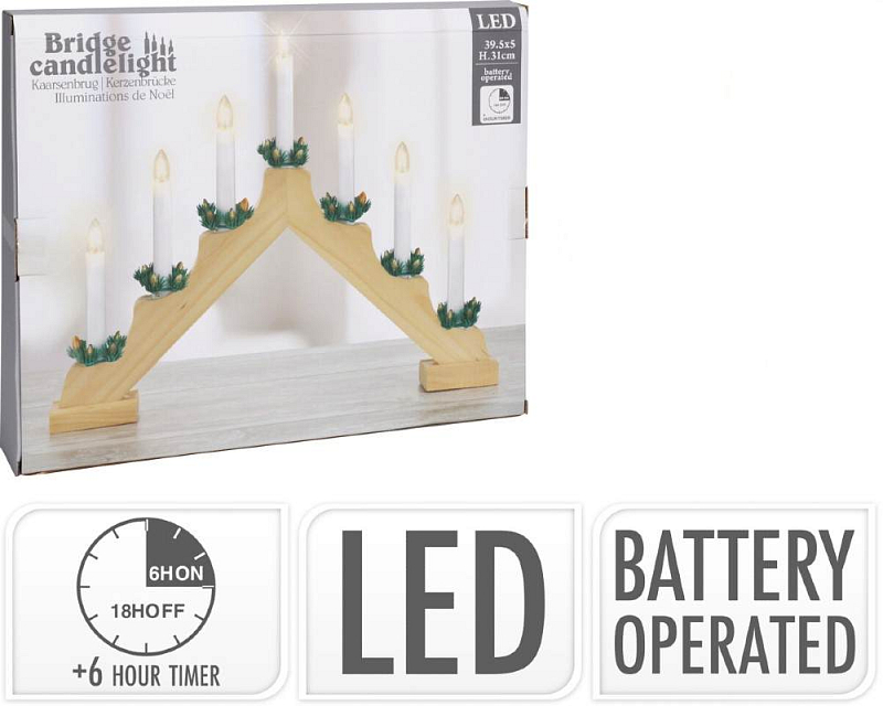 Vánoční dekorace LED svícen přírodní stojan 395X50X310MM, barva LED: teplá bílá, napájení 2 x AA baterie, časovač