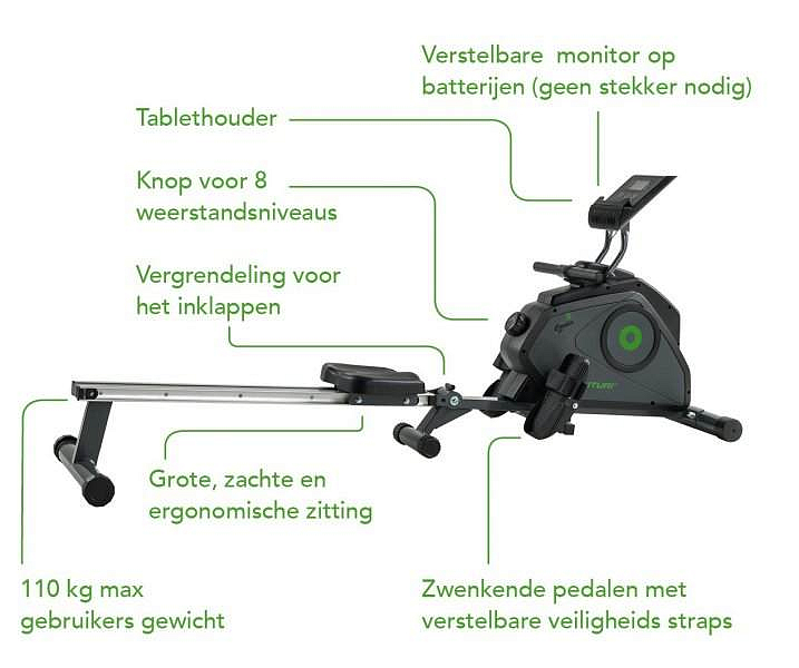 • Kompaktní trenažér pro domácí použití • Skládací kolejnice vyrobené z hliníku pro pohodlné skladování • Držák tabletu • Komfortní ergonomické sedlo pro ideální pozici při veslování