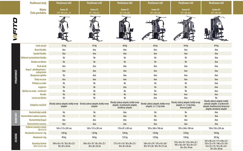 Posilovací věž VIFITO Gama 30 je základním modelem oblíbené značky VIFITO. Věž je určena pro nenáročné domácí využití, pro uživatele, kteří si chtějí na malém prostoru občas zacvičit, vytvarovat postavu a nabrat svalovou hmotu. Závaží je řešeno pomocí klasických cihliček, díky přesnému zpřevodování umožňuje na vybraných adaptérech cvičení s vahou až 60 kg. Nastavení požadované váhy je snadné, rychlé a bezpečné i pro začátečníky.