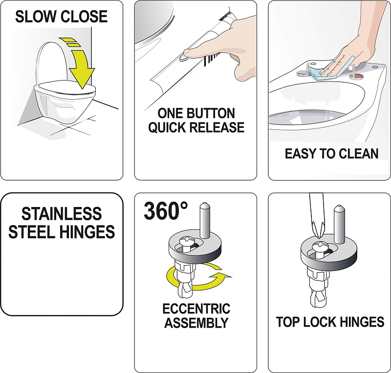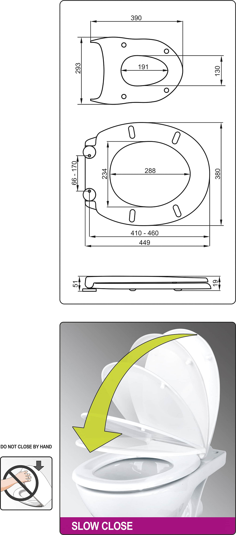 WC prkénko SLIM se zpomalovacím sklápěcím mechanizmem, zajišťuje tiché a volné dosednutí prkénka k míse. Díky lehce odnímatelnému systému klik-klak je možné prkénko zcela sundat a snadno tak vyčistit běžně nedostupná místa. Do příslušenství patří i děstká vložka. Prkénko z polypropylenu (antibakteriální povrch) je k míse přichyceno pomocí dvou ocelových ekcentrických adaptérů.