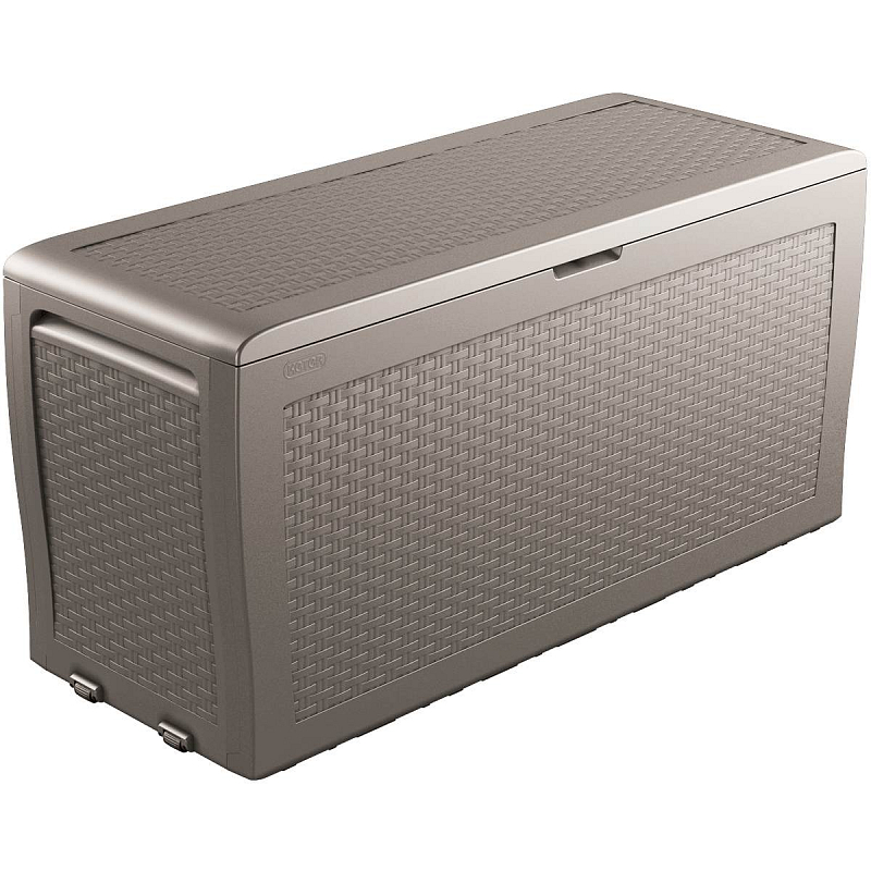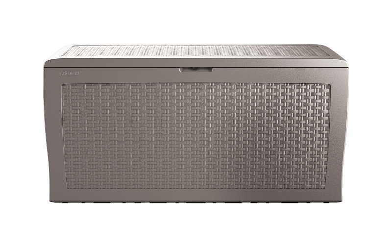pryskyřice v moderním designu, který imituje strukturu přírodního ratanu. Skříň je nízká a její dno zvládne unést až 30 kg nákladu a víko vydrží zatížení až 150 kg, takže je ideální i pro skladování podstatně težších věcí. Stěny jsou vyztužené žebrovými segmenty,